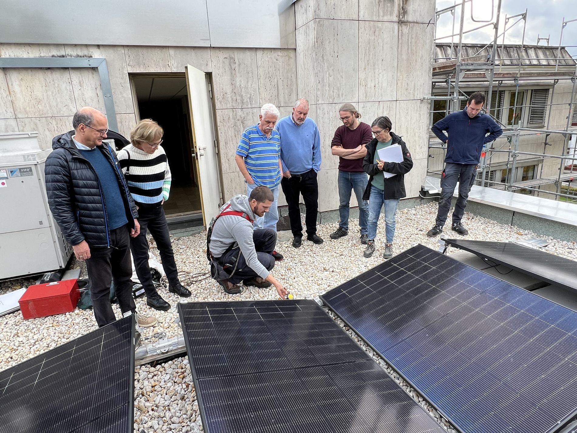 Herr Seel, für die Gemeindeverwaltung, der Vorstand der BEG (Neuhaus und Veit) in Begleitung von Aufsichtsratsvorsitzender Magda Dewes, Frau Kreckel vom Planungsbürg Ries & Ries, zwei Mitarbeiter der Installationsfirma INEK, sowie Levin Streit und Florian Grohs von der Urstrom eG versammelten sich zur technischen Abnahme der Solaranlage und der Absturzsicherung (für Wartungsarbeiten) auf dem frisch sanierten Norddach des Budenheimer Rathauses.